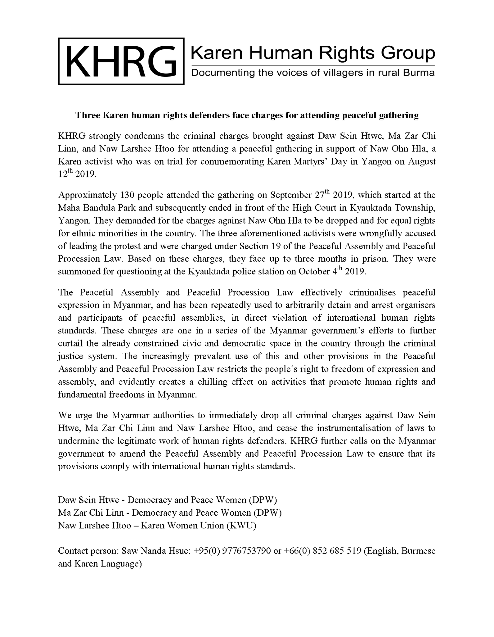Three Karen activists, Naw Ohn Hla, Saw Albert Cho and Sa Thein Zaw Min were sentenced to 15 days in prison for not complying with an order to delete the word “martyr” from this year’s commemoration. The Karen Human Rights Group released a statement condemning the arrests, and also criticized the Peaceful Assembly and Peaceful Procession Law which has been ‘repeatedly used to arbitrarily detain and arrest organisers of peaceful expression in Burma.’
